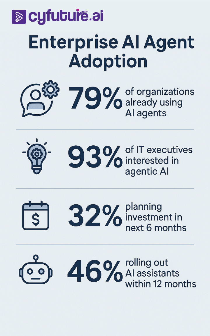 93% of IT executives express strong interest in agentic AI technology, with 32% planning to invest within the next six months. The adoption is accelerating rapidly—79% of organizations report they have already adopted AI agents to some extent.