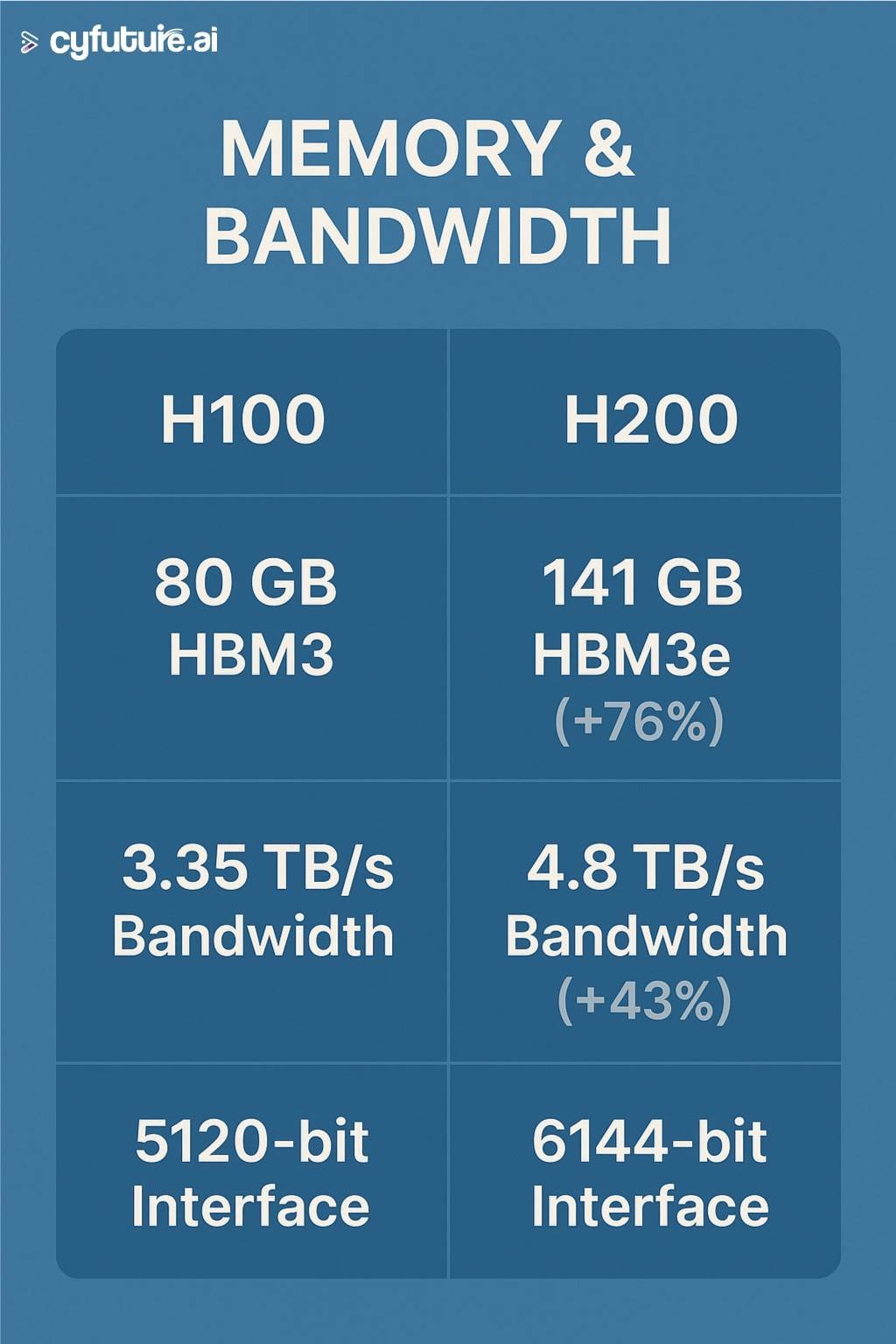 The H200 maintains the same compute architecture as the H100 but solves the critical memory bottleneck that has plagued AI developers working with increasingly large models. The H200 features 76% more memory (VRAM) than the H100 and a 43% higher memory bandwidth, making it particularly powerful for memory-intensive applications.