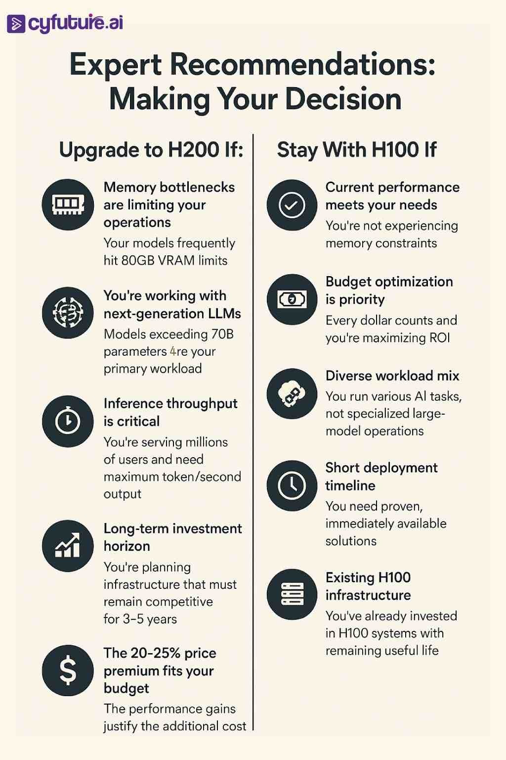 If your workloads involve large AI models, high memory demand, or require maximum efficiency, upgrading to the H200 can deliver significant benefits. For moderate workloads, the H100 still performs excellently.
