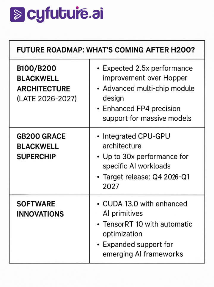 The H200 represents mature, production-ready technology with a solid 3-5 year useful lifecycle. The Hopper architecture's widespread adoption ensures robust software support and optimization continuing through 2028-2029.