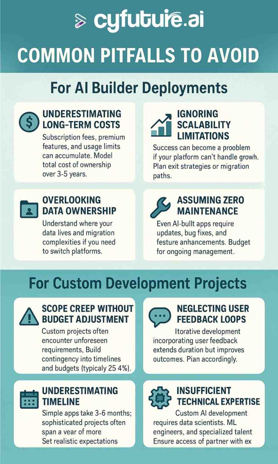 While AI app builders offer compelling advantages, custom development remains essential for specific scenarios:
